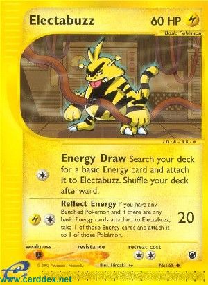 Falls du mindestens ein Pokemon auf deiner Bank hast und mindestens eine Basis-Energiekarte an Elektek angelegt ist, nimm 1 dieser Energiekarten und lege sie an 1 dieser Pokemon an.