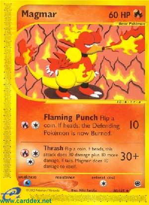 Kosten: Flip a coin. If heads, this attack does 30 damage plus 10 more damage. If tails, Magmar does 10 damage to itself.  Schaden: