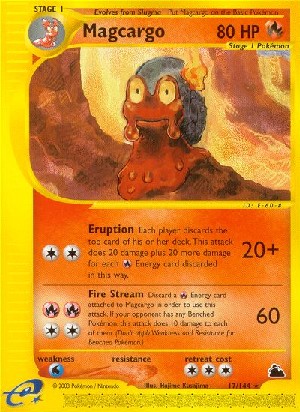 Kosten: Lege eine an Magcargo angelegte -Energiekarte auf deinen Ablagestapel, um diesen Angriff zu verwenden. Wenn dein Gegner über Pokémon auf der Bank verfügt, fügt dieser Angriff jedem von ihnen 10 Schadenspunkte zu. (Wende keine Schwäche oder Resistenz bei Pokémon auf der Bank an.)  Schaden: