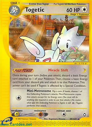 Kosten: Flip a coin. If heads, choose 1 of the Defending Pokemon´s attacks. Mini-Metronome copies that attack exept for its Energy cost. ( You must still do anything else required in order to use that attack.) ( No matter what type the Defending Pokemon is, Togetic is still .) Togetic performce that attack.  Schaden: