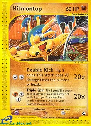 Flip 3 coins. This attack does 20 damage times the number of heads. If you get 2 or more heads, switch Hitmontop with 1 of your Benched Pokemon, if any.