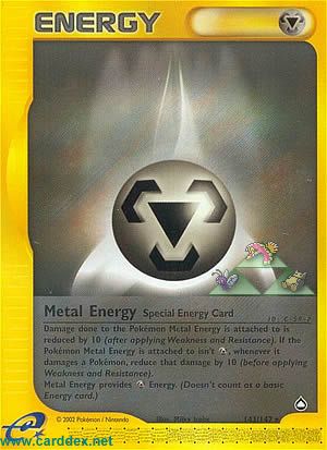 Damage done to the Pokémon Metal Energy is attached to is reduced by 10 (after applying Weakness and Resistance). If the Pokémon metal Energy is attached to isn´t , whenever it damages a Pokémon, reduce that damage by 10 (before applying Weakness and Resistance). Metal Energy provides Energy. (Doesn´t count as a basic Energy card.)