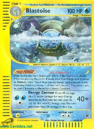 Once during your turn (before you attack), if Blastoise is your Active Pokémon, you may flip a coin. If heads, discard an Energy card attached to Blastoise. Then, if there any Energy cards attached to the Defending Pokémon, choose 1 of them and discard it. This power can't be used if Blaistoise is affected by a Special Condition.