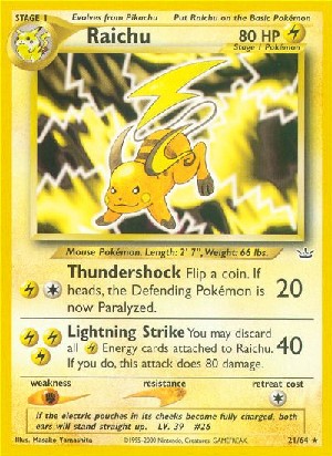 Kosten: You may discard all @energie cards attached to Raichu. If you do, this attack does 80 damage.  Schaden:
