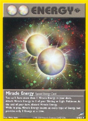 Beschreibung: Du kannst maximal 1 Wunder-Energie in deinem Deck haben. Lege Wunder-Energie an eines deiner Schimmernden oder Hellen Pokémon an. Lege am Ende deines Zuges Wunder-Energie auf deinen Ablagestapel. Solange Wunder-Energie im Spiel ist, zählt Wunder-Energie als jeder Energietyp, erzeugt aber 2 Energie gleichzeitig.
