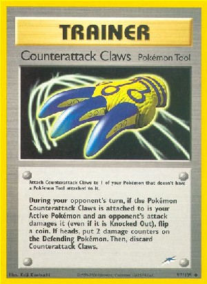 Beschreibung: During your opponent´s turn, if the Pokémon Counterattack Claws is attached to is your Active Pokémon and an opponent´s attack damage it (even if it is Knocked Out), flip a coin. If heads, put 2 damage counters on the Defending Pokémon. Then, discard Counterattack Claws.