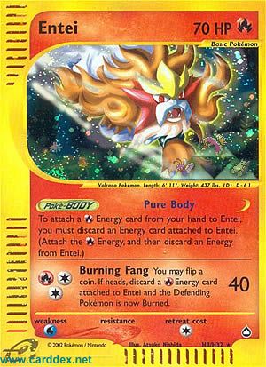 Kosten: Du kannst eine Münze werfen. Lege bei "Kopf" eine an Entei angelegte -Energiekarte auf deinen Ablagestapel, und das Verteidigende Pokémon ist jetzt verbrannt.  Schaden: