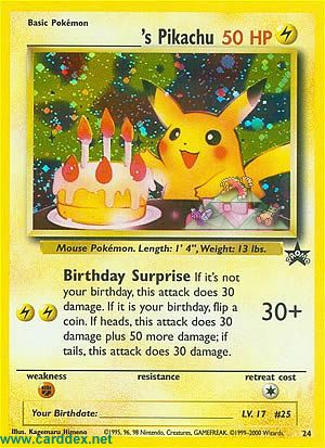 Kosten: If it's not your birthday, this attack does 30 damage. If it is your birthday, flip a coin. If heads, this attack does 30 damage plus 50 more damage; if tails, this attack does 30 damage.  Schaden: