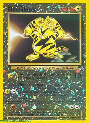 Kosten: Flip a coin. If heads, this attack does 30 damage plus 10 more damage; if tails, this attack does 30 damage and Electabuzz does 10 damage to itself.  Schaden: