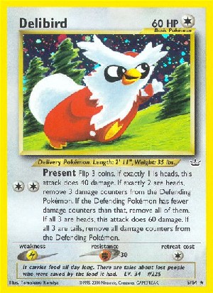 Wirf 3 Münzen. Wenn du genau einmal 'Kopf' geworfen hast, fügt dieser Angriff 40 Schadenspunkte zu. Wenn du genau zweimal 'Kopf' geworfen hast, entferne 3 Schadensmarken vom verteidigenden Pokémon. Falls das verteidigende Pokemon weniger Schadensmarken hat, entferne alle. Wenn du genau dreimal 'Kopf' geworfen hast, fügt dieser Angriff 60 Schadenspunkte zu. Wenn du jedesmal 'Zahl' geworfen hast, entferne alle Schadensmarken vom verteidigenden Pokémon. |