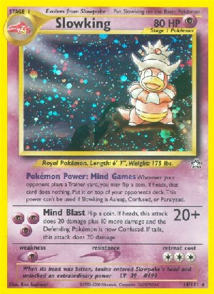 Whenever your opponent play a Trainer card, you may flip a coin. If heads, that card does nothing. Put it on top of your opponent´s deck. This power can´t be used if Slowking is Asleep, Confused, or Paralyzed.