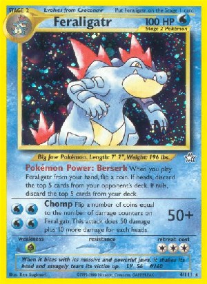 When you play Feraligatr from your hand, flip a coin. If heads, discard the top 5 cards from your opponent´s deck. If tails, discard the top 5 cards from your deck.