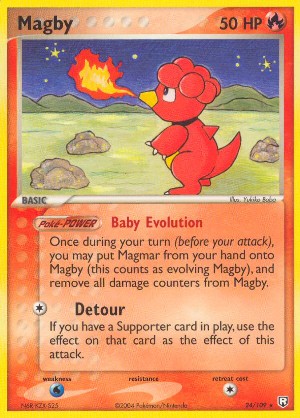 Once during your turn (before your attack), you may put Magmar from your hand onto Magby (this counts as evolving Magby), and remove all damage counters from Magby.