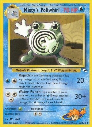 Kosten: Flip a number of coins equal to the number of Energy attached to Misty´s Poliwhirl. This attack does 30 damage plus 10 damage for each heads.  Schaden:
