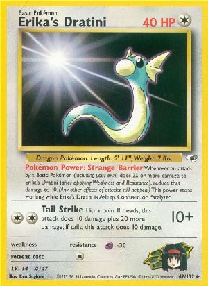 Whenever an attack by a basic Pokémon (including your own) does 20 or more damage to Erika´s Dratini (after applying Weakness and Resistance), reduce that damage to 10. (Any other effects of attacks still happen.) This power stops working while Erika´s Dratini is Asleep, Confused, or Paralyzed.