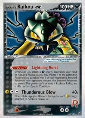 | Eingetragen von: Iruini | Pokémon-EX: Wenn Rockets Raikou ex kampfunfähig wird, nimmt dein Gegner 2 Preise. |