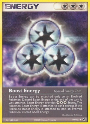 Beschreibung: Boost Energy can be attached only to an Evolved Pokemon. Discard Boost Energy at the end of the turn it was attached. Boost Energy provides Energy. The Pokemon Boost Energy is attached to can't retreat. If the Pokemon Boost Energy is attached to isn't an Evolved Pokemon, discard Boost Energy.
