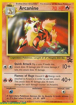 Kosten: Discard 2 -Energy cards attached to Arcanine in order to use this attack. This attack does 40 damage plus 10 more damage for each damage counter on Arcanine.  Schaden: