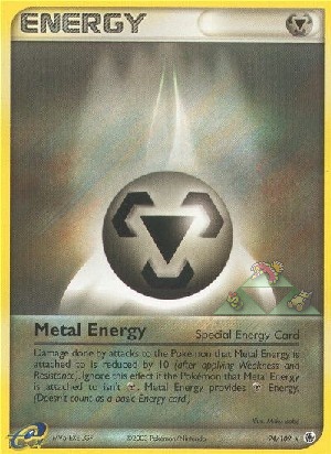 Beschreibung: Schaden, der dem Pokémon, an das Metall-Energie angelegt ist, durch Angriffe zugefügt wird, wird um 10 reduziert (nachdem Schwäche und Resistenz verrechnet wurden). Dieser Effekt wirkt nur, wenn die Metall-Energie an einem Pokémon vom Typ angelegt ist. Metall-Energie liefert -Energie. (Zählt nicht als Basis-Energiekarte.)