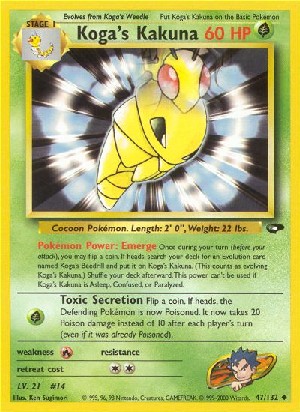 Once during your turn (before your attack), you may flip a coin. If heads, search your deck for an Evolution card named Koga's Beedrill and put it on Koga's Kakuna. (Thous counts as evolving Koka's Kakuna.) Shuffle your deck afterward. This power can't be used if Koga's Kakuna is Asleep, Confused, or Paralyzed.