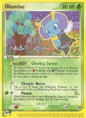 Solange Volbeat im Spiel ist, wird jeder Schaden, der Illumise durch Angriffe von -Pokémon und -Pokémon zugefügt wird, um 30 Schadenspunkte reduziert. Der Schaden wird maximal um 30 Schadenspunkte reduziert, auch wenn mehr als 1 Volbeat im Spiel ist.