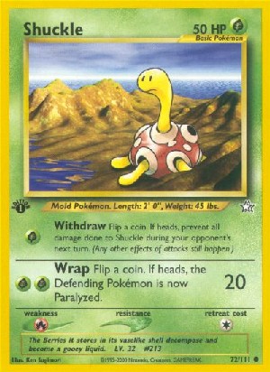 Kosten: Flip a coin. If heads, prevent all damage done to Shuckle during your opponent's next turn. (Any other effects of attacks still happen.)  Schaden: