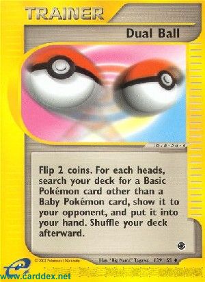 Flip 2 coins. For each heads, search your deck for a Basic Pokémon card other than a Baby Pokémon card, show it to your opponent, and put it into your hand. Shuffle your deck afterward.