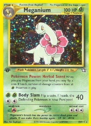 When you play Meganium from your hand, you may flip a coin. If heads, remove all damage counters from all Pokémon in play.
