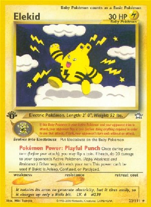 Once during your turn (before your attack), you may flip a coin. If heads, do 20 damage to your opponent's Active Pokémon. (Apply Weakness and Resistance.) Either way, this ends your turn. This power can't be used if Elekid is Asleep, Confused, or Paralyzed.