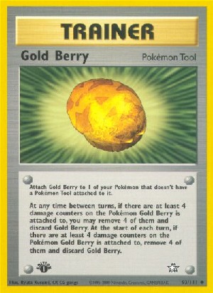 Beschreibung: At any time between turns, if there are at least 4 damage counters on the Pokémon Gold Berry is attached to, you may remove 4 of them and discard Gold Berry. At the start of each turn, if there are at least 4 damage counters on the Pokémon Gold Berry is attached to, remove 4 of them and discard Gold Berry.