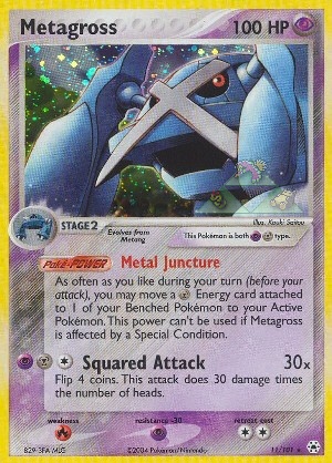As often you like during your turn (before your attack), you may move a Energy card attached to 1 of your Benched Pokemon to your Active Pokemon. This power can't be used if Metagross is affected by a Special Condition.