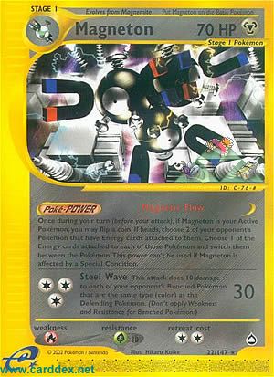 Once during your turn (before your attack), if Magneton is your Active Pokémon, you may flip a coin. If heads, choose 2 of your opponent's Pokémon that have Energy cards attached to them. Choose 1 of the Energy cards attached to each of those Pokémon and switch them between the Pokémon. This power can't be used if Magneton is affected by a Special Condition.