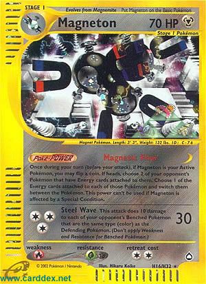 Once during your turn (before your attack), if Magneton is your Active Pokémon, you may flip a coin. If heads, choose 2 of your opponent's Pokémon that have Energy cards attached to them. Choose 1 of the Energy cards attached to each of those Pokémon and switch them between the Pokémon. This power can't be used if Magneton is affected by a Special Condition.