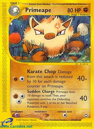 Kosten: Primeape does 10 damage to itself. Then, your opponent switches the Defending Pokémon with 1 of his or her Benched Pokémon, if any.  Schaden: