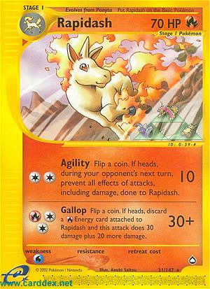Kosten: Flip a coin. If heads, discard a Energy card attached to Rapidash and this attack does 30 damage plus 20 more damage.  Schaden: