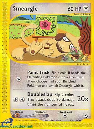 Kosten: Flip a coin. If heads, the Defending Pokémon is now Confused. Then, choose 1 of your Benched Pokémon and switch Smeargle with it.  Schaden: