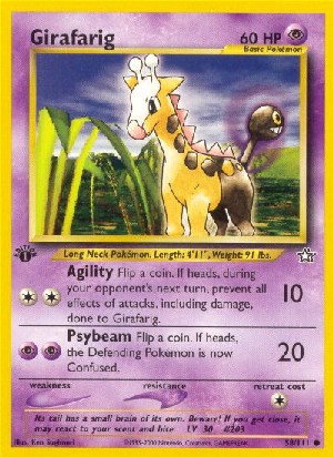 Kosten: Flip a coin. If heads, during your opponent's next turn, prevent all effects of attacks, including damage, done to Girafarig.  Schaden: