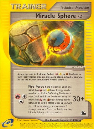 Lege diese Karte an 1 deiner entwickelten , oder Pokemon im Spiel an. Dieses Pokemon kann den Angriff dieser Karte anstatt seines eigenen verwenden. Lege am Ende deines Zuges die Wunder Sphäre a auf deinen Ablagestapel