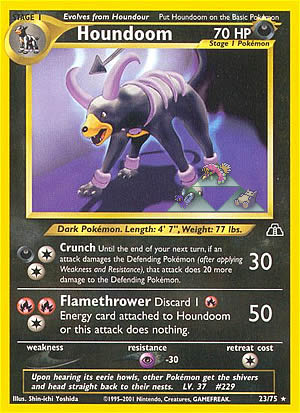 Kosten: Discard 1 Energy card attached to Houndoom or this attack does nothing.  Schaden: