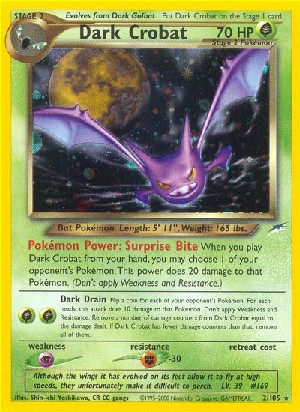 When you play Dark Crobat from your hand, you may choose 1 of your opponent's Pokémon. This power does 20 damage to that Pokémon. (Don't apply Weakness and Resistance.)