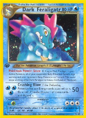 As long as Dark Feraligatr is your Active Pokémon, all of your opponent's Baby Pokémon Powers stop working and your opponent's Baby Pokémon can't attack. This power stops working while Dark Feraligatr is Asleep, Confused, or Paralyzed.