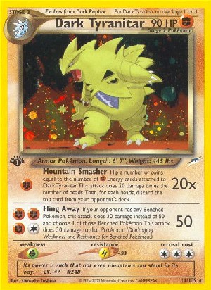 Kosten: Flip a number of coins equal to the number of Energy cards attached to Dark Tyranitar. This attack does 20 damage times the number of heads. Then, for each heads, discard the top card from your opponent's deck.  Schaden: