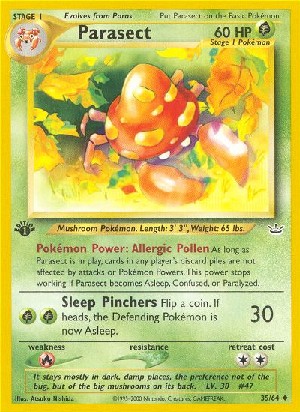 As long as Parasect is in play, cards in any player's discard piles are not affected by attacks or Pokémon Powers. This power stops working, if Parasect becomes Asleep, Confused, or Paralyzed.