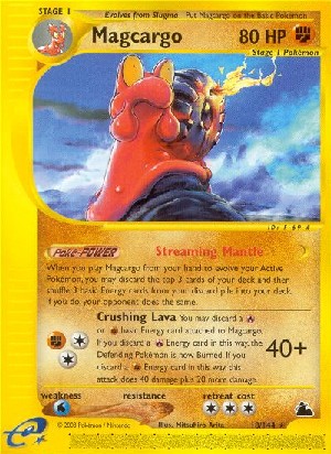 Wenn du Magcargo aus deiner Hand spielst, um dein aktives Pokémon zu entwickeln, kannst du die obersten 3 Karten deines Decks auf deinen Ablagestapel legen und dann 3 Basis-Energiekarten aus deinem Ablagestapel in dein Deck mischen. Falls du dies tust, tut es dein Gegner ebenfalls.