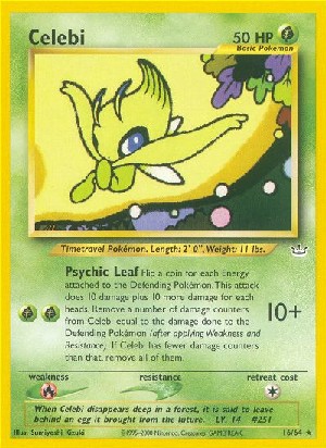Flip a coin for each Energy card attached to the Defending Pokémon. This attack does 10 damage plus 10 more damage for each heads. Remove a number of damage counters from Celebi equal to the damage done to the Defending Pokémon (after applying Weakness and Resistance). If Celebi has fewer damage counters than that, remove all of them.