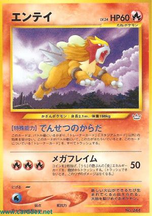 Solange Entei dein aktives Pokémon ist, sind Stadion-Karten, die einzigen Trainer-Karten, die Auswirkungen auf Entei und an es angelegte Energiekarten haben. Solange diese Fähigkeit aktiv ist, lege alle Trainerkarten, die an Entei angelegt sind, auf den Ablagestapel. (Diese Fähigkeit wirkt selbst dann, wenn Entei schläft, verwirrt oder gelähmt ist.)