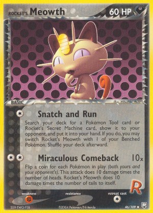 Search your deck for a Pokémon Tool card or Rocket's Secret Machine card, show it to your opponent, and put it into your hand. If you do, your may switch Rocket's Meowth with 1 of your Benched Pokémon. Shuffle your deck afterward.