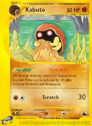 Jeder Schaden, der Kabuto durch Angriffe von entwickelten Pokémon zugefügt wird, wird um 10 reduziert (nachdem Schwäche und Resistenz verrechnet wurden).