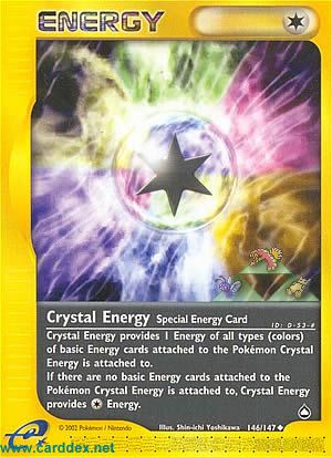 Beschreibung: Kristall-Energie liefert 1 Energie aller Typen (Farben) von Basis-Energiekarten, die an das Pokémon angelegt sind, an das Kristall-Energie angelegt ist. Sind an das Pokémon, an das Kristall-Energie angelegt ist, keine Basis-Energiekarten angelegt, liefert Kristall-Energie -Energie.