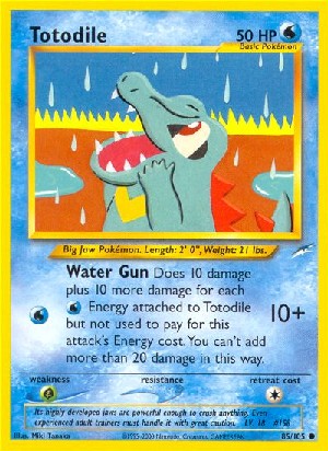 Does 10 damage plus 10 more damage for each Energy attached to Totodile but not used to pay for this attack's Energy cost. You can't add more than 20 damage in this way.